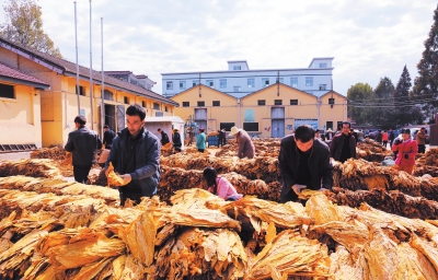 10月31日,徽县银杏树镇农民正在烤烟收购站交售烤烟。今年,徽县发展烤烟面积4000余亩,预计产烟叶56万公斤,烟农售烟收入1300余万元。通讯员 宋博