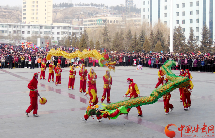 2月9日,农历正月十三,临夏和政县城锣鼓喧天,热闹非凡。7支农村秧歌队为全县人民送来节日祝福,一年一度的正月十三秧歌汇演吸引了近万名群众和临近县市群众前来观看,给节日的和政县城增添了浓浓的年味。图为在该县聚兴广场为群众汇报演出。(通讯员 邓仲祥 摄)