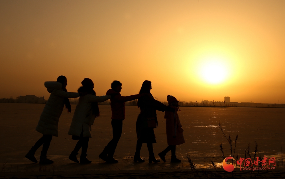 2018年的第一缕阳光撒向甘肃张掖国家湿地公园时,游客在阳光的剪影中拍照。