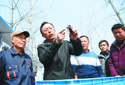 入春以来,安徽省五河县开展“扶贫课堂”进乡村活动。图为3月6日,农业技术人员在五河县沱湖乡大岗村沱湖稻虾共作养殖基地向贫困户及村民讲解小龙虾养殖知识。新华社发