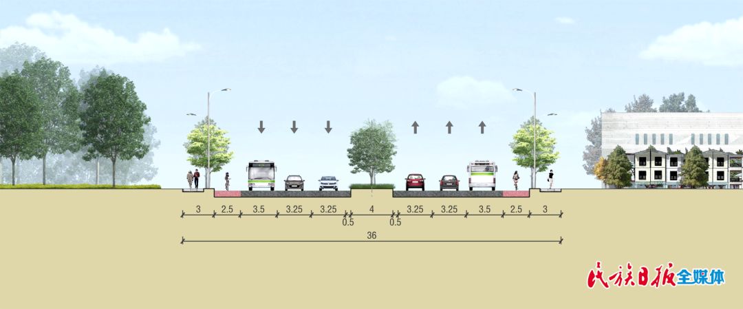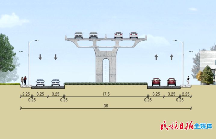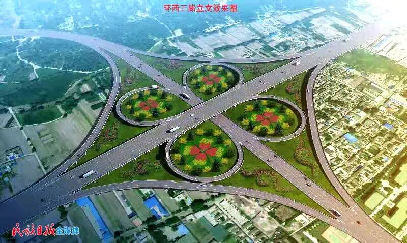 据项目可研报告显示,新建的环城北路设计安全等级为一级,全程没有交通信号灯,所有交叉口覆盖立交,能够最大限度保证车辆快速分流行驶,不足30分钟即可跑完全程。工程分为环城北路段、折桥北路段和G310线至G568线连接线三段,道路主线为双向六车道、红线宽度36米,道路北侧沿线设计10.4公里排洪渠,全线共设立立交7处、主线桥10座、涵洞31处。