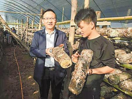 李江涛(左)在食用菌大棚查看脱贫产业发展情况。