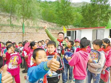 雷磊在扶贫援建的校园里为孩子们送上捐赠物品。