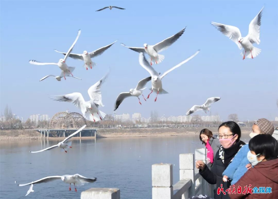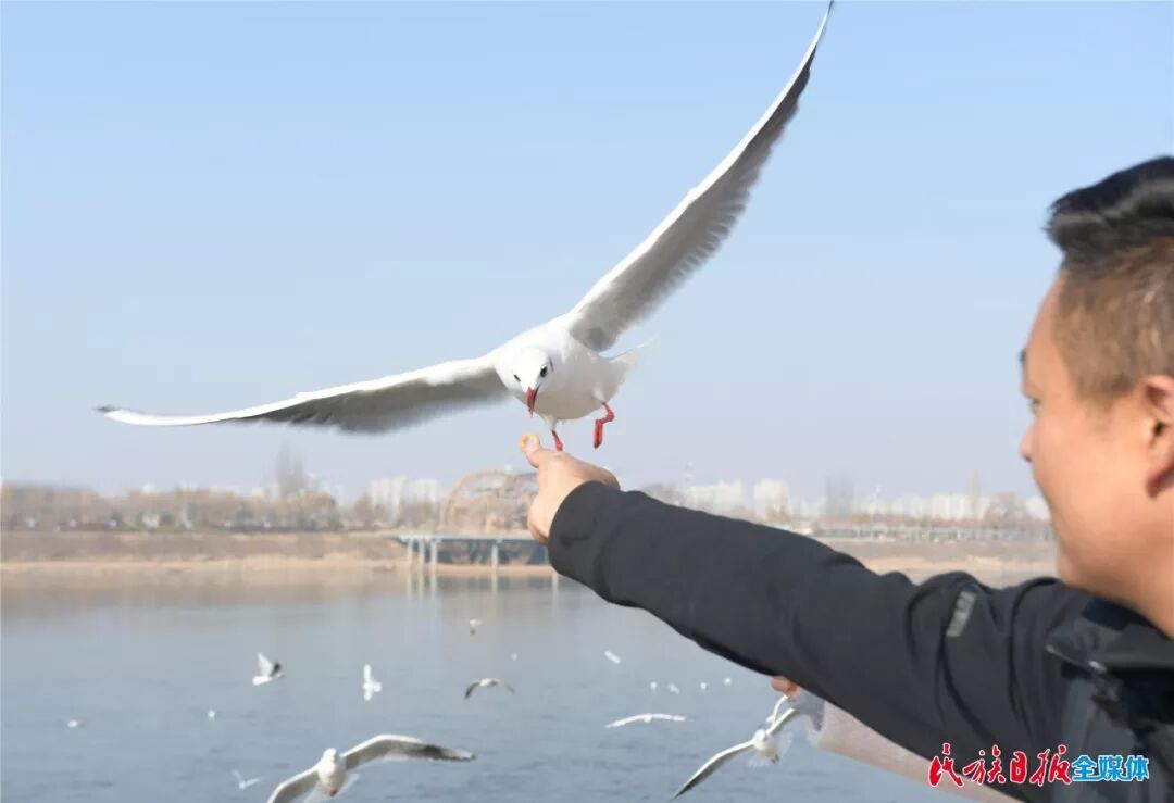 成群的红嘴鸥吸引了不少游客前来喂鸥赏景