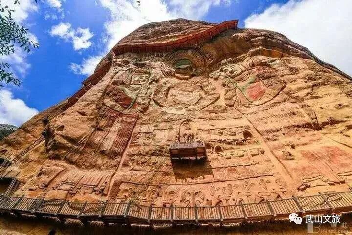 武山县水帘洞景区四季分明,气候宜人,风景秀丽,现为全国重点文物保护单位,国家4A级旅游景区。景区现有水帘洞、拉梢寺、千佛洞、显圣池四个石窟单元,其中水帘洞单元地形独特,气势雄伟,民间影响最大。景区地处峡谷地带,古称“木林峡”, 因沟谷回环、茂林蔽日而得名。民间流传有鲁班曾在此清修的传说,所以又名“鲁班峡”。这里为第三纪红砂岩,属丹霞地貌,景区内群峰耸立,赤壁丹崖,形态各异,有形似莲花的、也有状如巨象的,正所谓“色如渥丹,灿若明霞”,险峰雄奇,令人赞叹。