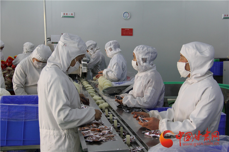 在甘肃田地白家食品有限责任公司的生产车间,工人们在生产线上有序开展工作。2018年,公司“来点土豆”系列自主品牌产品被全国马铃薯产业联盟授予“十大特色食品”荣誉称号。