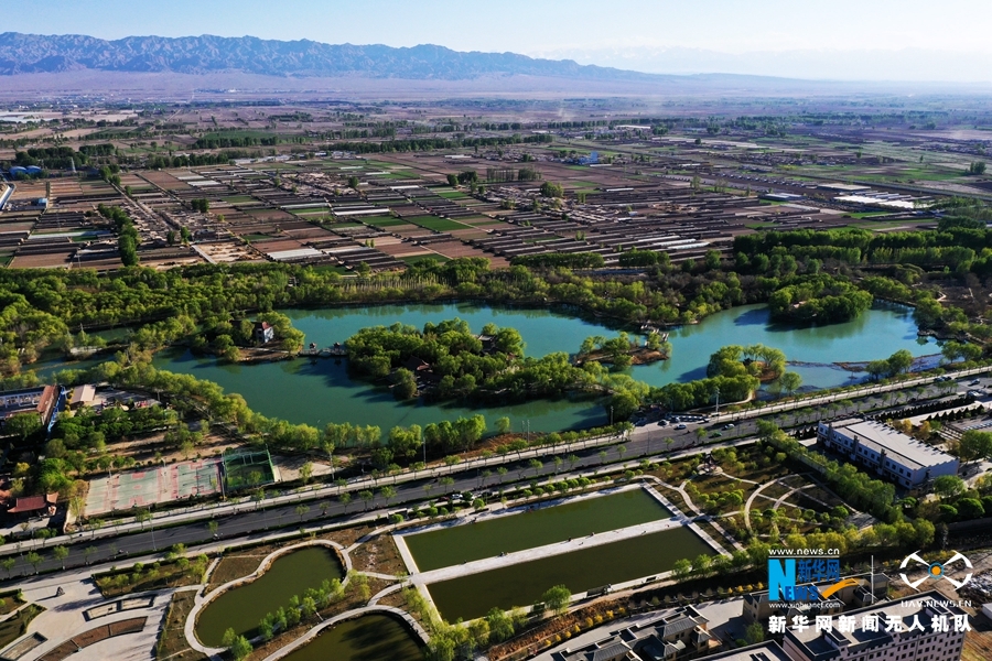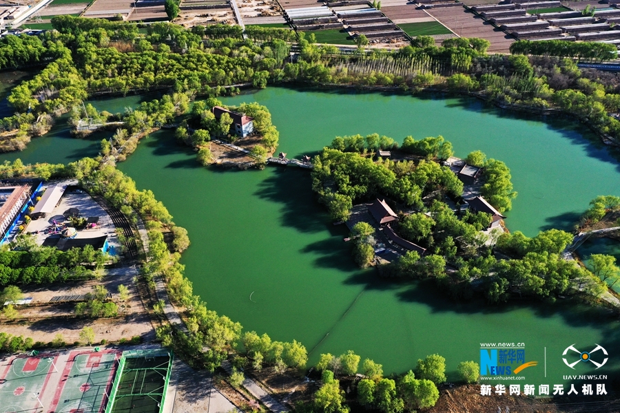 这是近日航拍的甘肃省张掖市高台县月牙湖公园。暮春时节,甘肃省张掖市高台县月牙湖公园绿柳似帘,湖面如镜,从百米高空俯瞰宛如“绿宝石”。