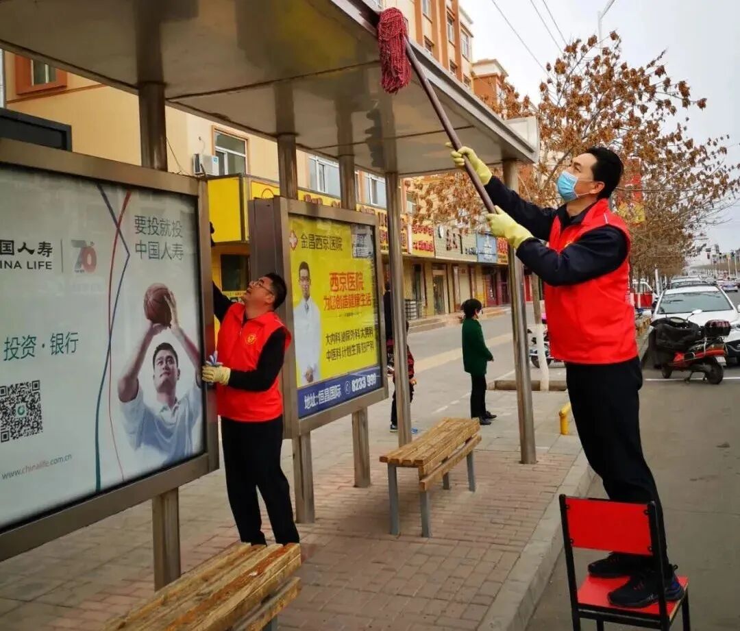 在川流不息的车辆和人群中,穿着红马甲、戴着红帽子的志愿者们俨然成了路边一道别样的风景。志愿者们对街道周边及沿街商铺的生活垃圾和小广告进行清理,自带抹布和水桶清洗公交站牌,对绿化带内的枯枝落叶、杂草等堆积物及时清理,为群众提供整洁、干净的生活环境。