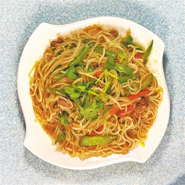 肉末粉条,是一道荤素搭配,鲜香爽口的家常菜。这道菜所用的水粉是由红薯、马铃薯、大豆等原料加工制成的粉条。水粉是临夏的特产,它色白,条细,养分多,适于熬菜,烹炒和凉拌菜用,口感爽滑有韧性,颇受食客喜爱。