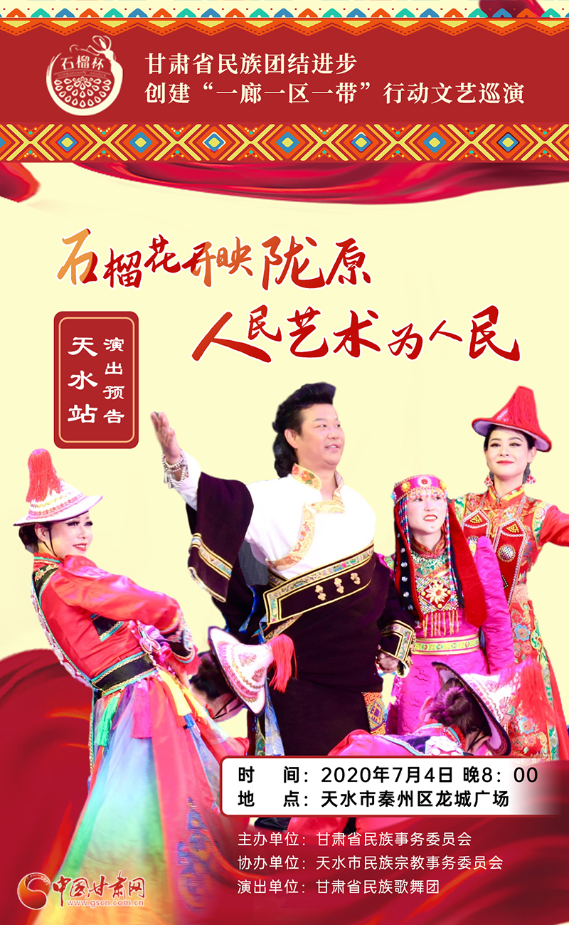 据悉,7月4日晚8时,“石榴杯”甘肃省民族团结进步创建“一廊一区一带”行动文艺巡演将在天水市秦州区龙城广场上演。