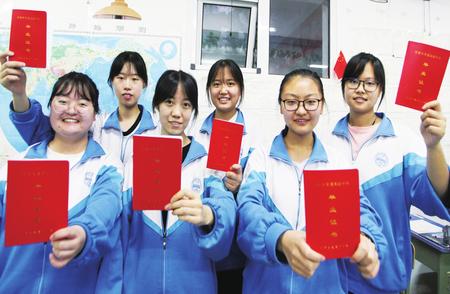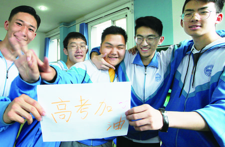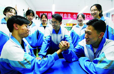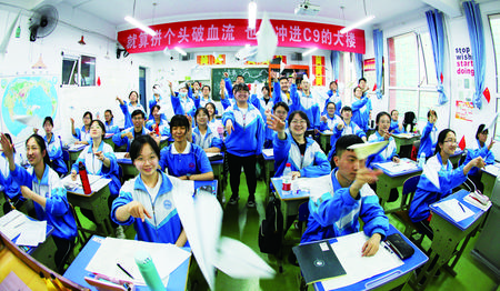 高三学生将写有自己梦想的纸飞机抛向空中,释放紧张情绪。