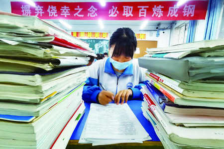 记者 瞿娟 文/图 “淡泊功利,轻装前进”“决不为失败找借口,只为成功找方法”“不比智力比努力;青春是用来拼搏的……”7月1日,距离高考还剩6天,记者走进兰州市第二中学高三年级的教室。随处可见醒目的励志标语,为考生们树立一面奋斗的旗帜。课桌上堆满了书籍,同学们正在紧锣密鼓抓紧时间埋头做题,进行最后的冲刺。 今年的高考,对考生来说特殊且不易,全国高考时间因新冠疫情延后一个月。距离2020年的全国高考不到一星期了,学生们充分利用最后几天的学习时光抓紧复习,查漏补缺。虽然高考不再是成才的唯一途径,但对于大部分人来说,高考仍然是改变个人命运的最好机会。 即将参加高考的学生罗李秋,每天早上六点准时起床,晚上在零点后睡觉,她充分利用每一秒时间,抓紧复习,备战高考。刚得知高考延期时她心情有点复杂,这样又得多熬一个月,肯定会特别累,但是一路坚持走来,对她来说正是延期的这一个月,让她有更多的时间复习巩固各科概念知识,以更好的状态迎接高考。 在高考进入最后的关键冲刺时段,高三年级组长朱敏燕告诉记者,学校在做好高三学生复习备考的同时,根据高考时间变化及时调整学习计划,通过开展线上线下教学培训方式和多种形式的“减压”活动,帮助学生释放紧张情绪、提振信心,使全校五百多名高考生以自信、平和、乐观的心态迎接“人生大考”。