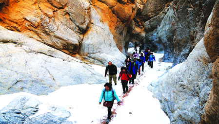 游客在张掖平山湖大峡谷内徒步旅行