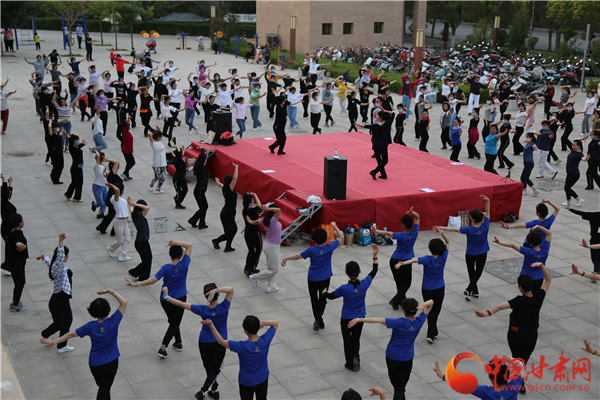 敦煌市文化馆工作人员辅导群众在广场上跳广场舞