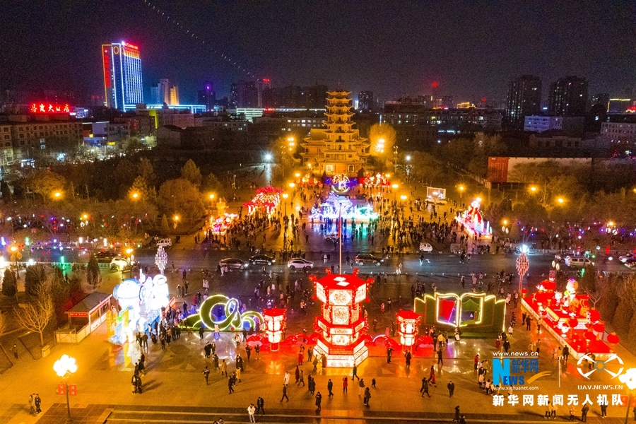 元宵节将近,河西走廊灯光璀璨、流光溢彩,“丝路古城”张掖市的传统彩灯与文创光影秀交相辉映,洋溢着浓郁的节日气氛。新华网发(成林 摄)