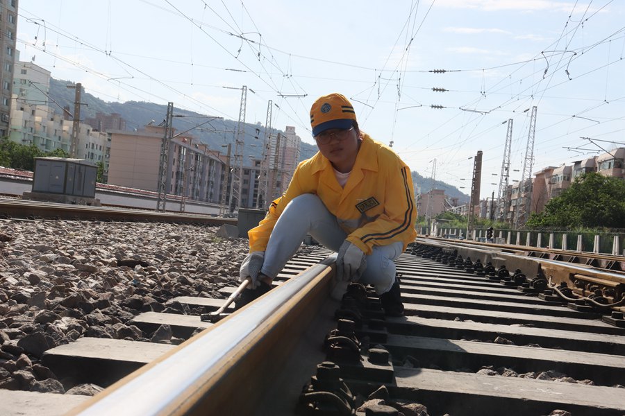 早上10点,在兰州车站西岔区6号道岔前,铁路工人韩哲、姚小媛和王婷婷身穿黄马甲、头戴小黄帽、脚穿劳保鞋、手提长道尺,一个跪趴在钢轨轨面上一丝不苟地查看钢轨是否平顺;一个在道岔旁走前忙后弓着腰仔细地看着钢轨轨向;一个提着道尺,一根枕木一根枕木地测量、标注轨距……烈日下的“三朵金花”在高温中绽放坚守。
