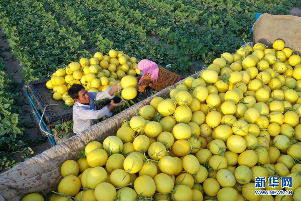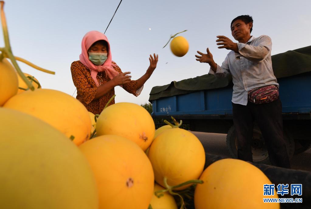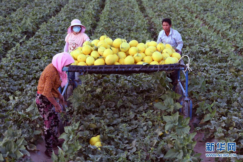 7月19日,在民勤县收成镇兴圣村,瓜农在田间装运蜜瓜。新华社记者 范培珅 摄