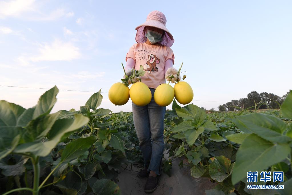 7月19日,在民勤县收成镇兴圣村,瓜农在田间采摘蜜瓜。新华社记者 范培珅 摄