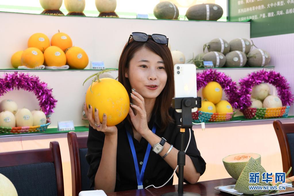 7月20日,在民勤县收成镇蜜瓜产业园,网络主播通过直播销售民勤蜜瓜。新华社记者 范培珅 摄