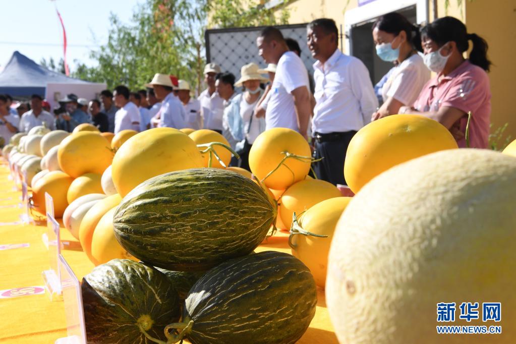 7月20日,在民勤县收成镇蜜瓜产业园,群众在观看瓜王评比活动上展出的民勤蜜瓜。新华社记者 范培珅 摄