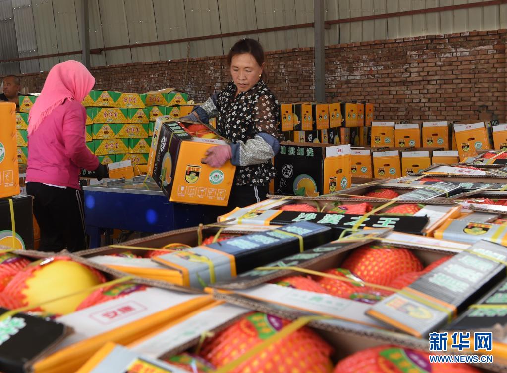 7月19日,在民勤县收成镇蜜瓜交易市场,瓜农将蜜瓜打包装箱。新华社记者 范培珅 摄