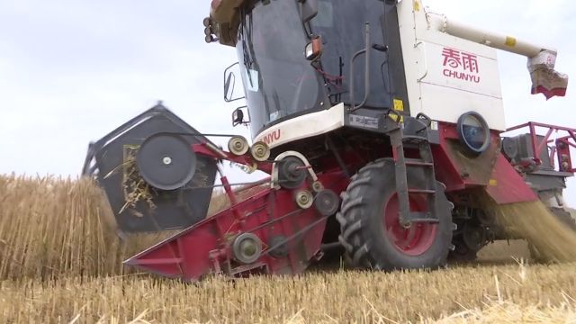 麦浪滚滚,机器轰鸣,收割机穿梭在麦田,颗颗饱满的麦粒喷涌而出,一派丰收景象。种植户张磊抢抓这两天晴好天气,雇佣同村农机大户,开展麦收工作。