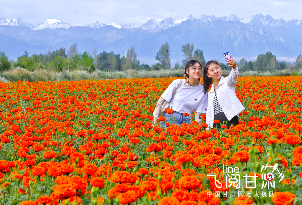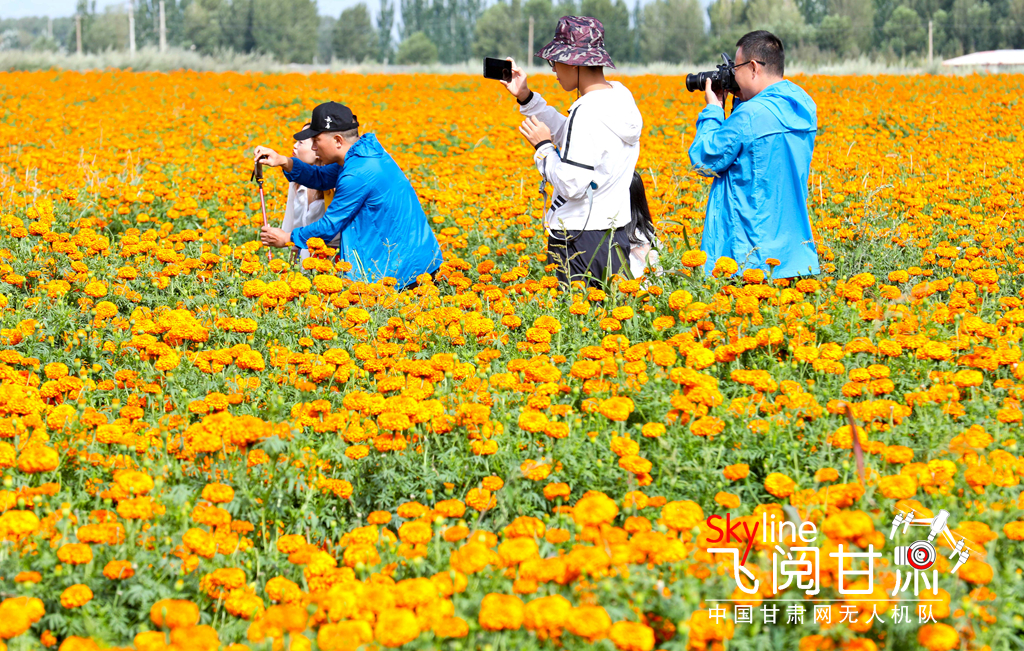 8月4日,位于祁连山北麓的甘肃民乐县六坝镇种植的1000多亩万寿菊进入盛花期,吸引了众多游客前来观赏。
