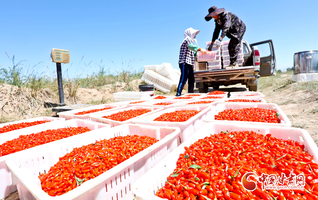连日来,张掖市甘州区安阳乡苗家堡村种植的3000多亩有机枸杞进入头茬采摘季,喜获丰收。