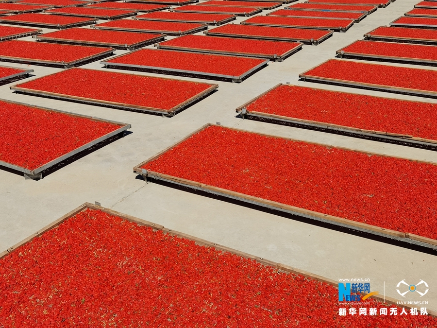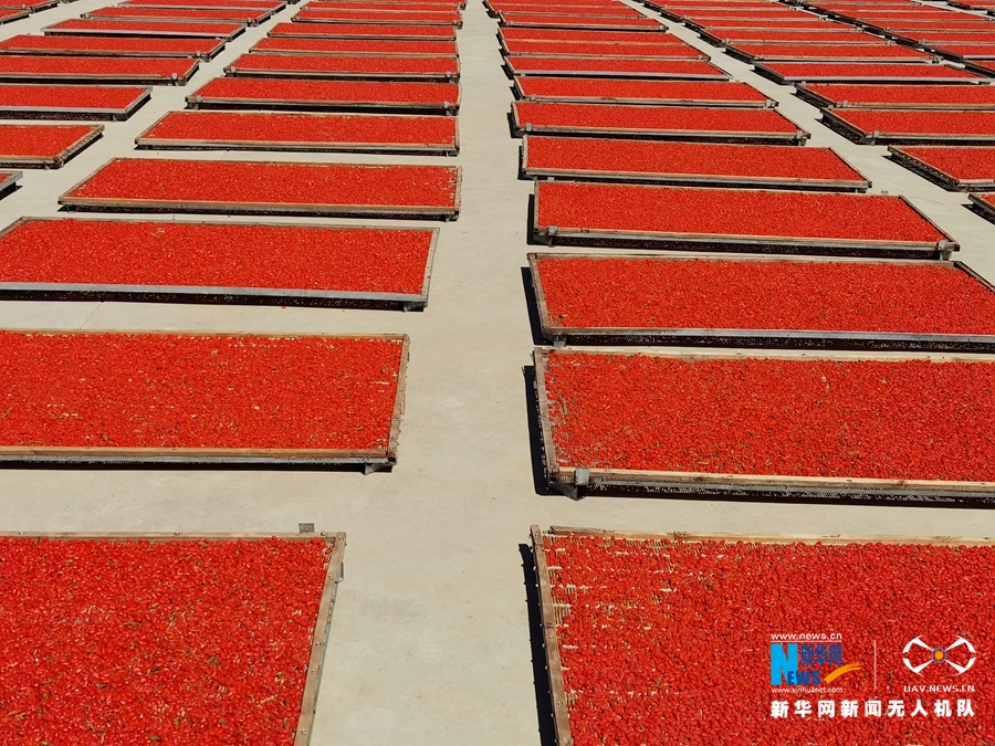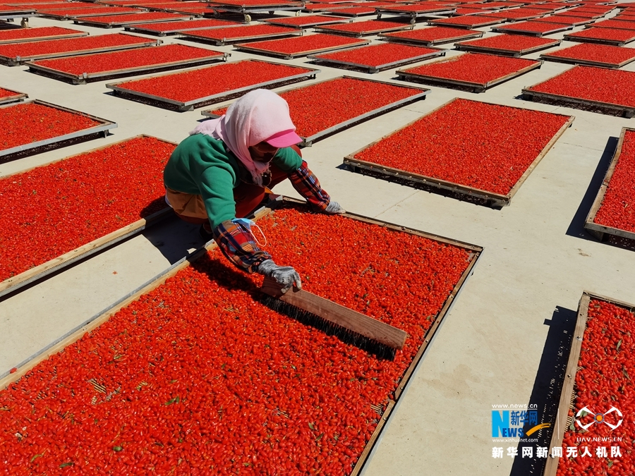 这是近日在甘肃省张掖市甘州区安阳乡苗家堡村拍摄的晾晒中的枸杞。新华网发(吴学珍 摄)