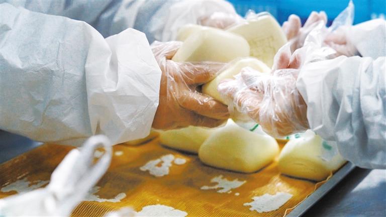 机器24小时开足马力运转,工人两班倒,每班20个人连轴转。和面、压面、面剂切割、上架、醒面、蒸制、出屉、打包……流水线上井然有序。兰州民生早餐食品有限公司总经理卜静安在车间不断巡查,质量关、卫生关、安全关,他都要操心。“这段时间,除了佩戴口罩,公司所有生产、配送人员都要求穿防护服,做到疫情防控和安全生产两不误。”他掰着指头算了一下,公司一直采购的是50斤装的面粉,这段时间每天要用去200袋面粉,也就是10000斤。按照30袋面粉做1万个馒头来算,平均每天出屉的馒头有六七万个。
