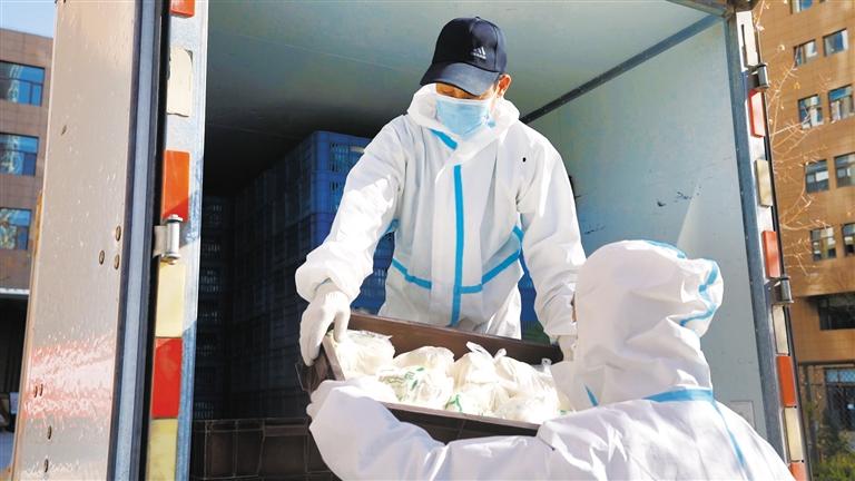 宋师傅是车队司机之一,他开的是一辆中型货车,一车能装两万个馒头,每天从早跑到晚,从东跑到西。“特殊时期,大家都辛苦,也不是我一个人这么拼!”宋师傅黑瘦精干,说话间一车馒头装齐又要出发了。11月10日下午3点左右,宋师傅运送馒头的车停在安澜祥园物业门口,“全副武装”的物业工作人员早早等候在那里。大家搬运、分装、分头上门派送。每户10个馒头,先按5个用塑料袋分装,再用专门订制的绿色环保手提袋装起来送到业主手中。