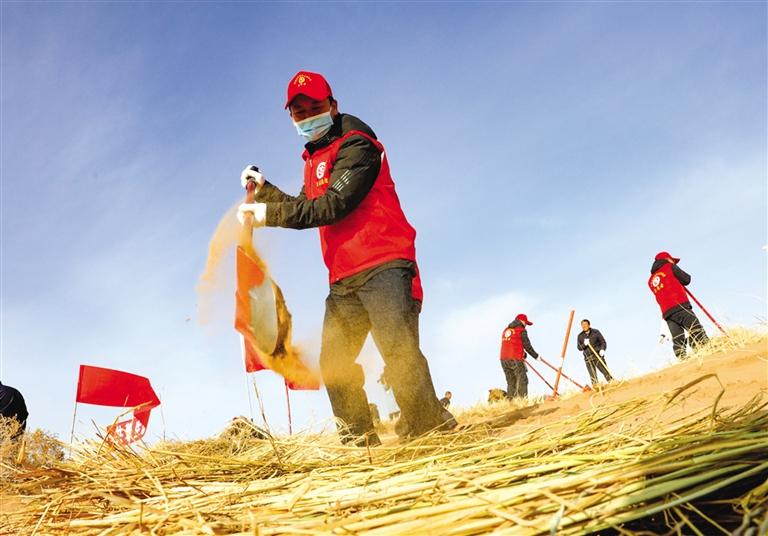 中国甘肃网3月4日讯 据兰州晚报报道(通讯员 许吉年 王梅梅 卢斐 刘常贇 记者 雒焕素 文/图)3月3日,来自古浪县城区各单位的1600多名机关干部职工挺进腾格里沙漠腹地,拉开2022年春季集中义务压沙活动的大幕。