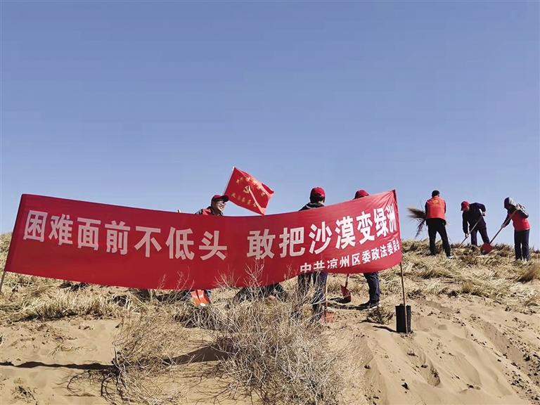 压沙现场,党旗飘扬,人头攒动,身穿志愿者红马甲的干部职工们在沙漠里干劲十足。据统计,近年来凉州区累计完成沙化土地治理141.54万亩,通过“造、封、管”并举的治理措施,重点流沙地段和零星沙丘得以控制,治理区林草覆盖度由不足15%提高到30%以上,防沙治沙工作取得明显成效。