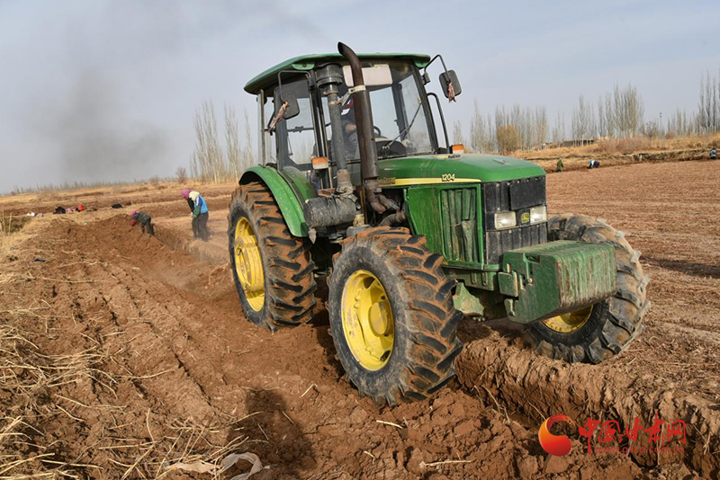 在转渠口镇定西村二组邵德禄的甘草地里,两年生甘草苗进入采挖期,轰鸣的拖拉机,正拉着单幅深铧犁,来往穿梭,一根根甘草被翻出地面,几十名工人将翻出的甘草拾拣成堆、拉运装车。