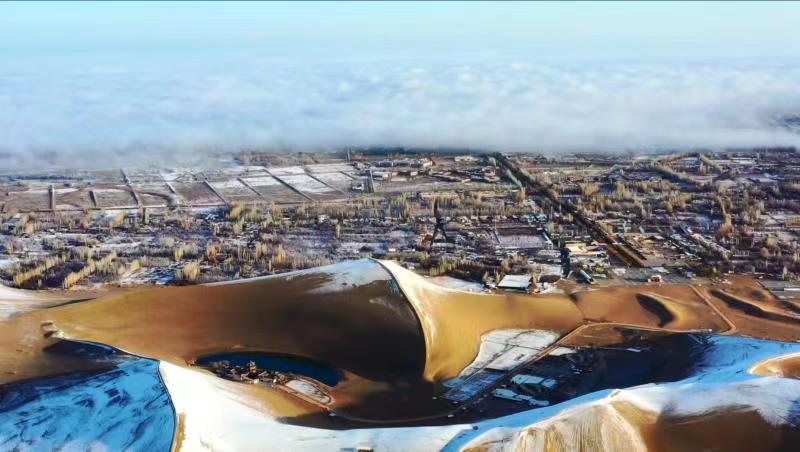 【中央媒体看甘肃】甘肃敦煌:春雪覆莫高 浓雾隐月牙