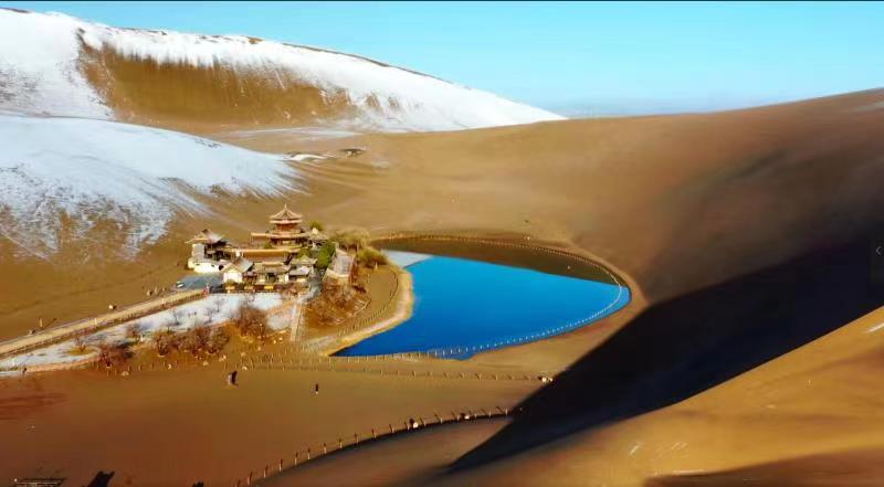 鸣沙山旁,碧波荡漾的月牙泉与皑皑白雪相互映衬,形成一幅美丽的画卷。而在世界文化遗产莫高窟的标志性建筑九层佛阁前,处处可见银装素裹、玉树琼枝的景象。(总台记者 张磊 王妍 马凌峰 毛月恒)