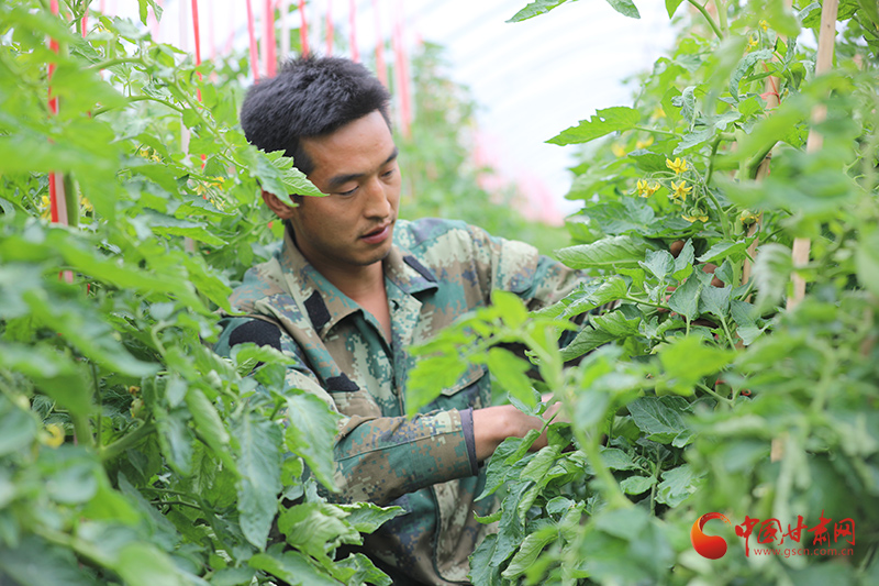 刘耀文,是石鸡坝村有机蔬菜种植大户刘换成的儿子,也是一名90后退伍军人。记者见到这位退伍不褪色的精干小伙时,他身着迷彩绿和务工村民正在大棚内不停地忙着,给西红柿疏叶、给黄瓜理蔓,给蔬菜通风、进行光合作用。