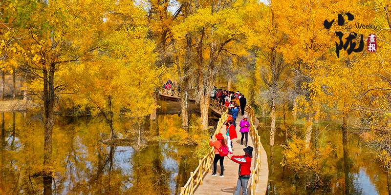 漫步林中,就仿佛进入神话中的仙境。茂密的胡杨干奇百怪,神态万般。粗壮、沧桑的胡杨几个人难以合抱,挺拔的有七八丈之高,怪异的似苍龙腾越、虬蟠狂舞。每一棵高大的树冠枝头,间或又有浅绿、淡黄的叶片在闪现,错落有致,色彩缤纷,满眼的赤橙黄绿与盈盈秋水互相映衬,令人叹为观止。