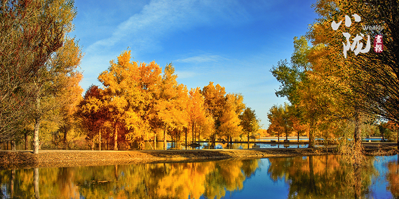 秋风起时,一树金黄在湛蓝的天空下连绵不绝,映着湖面,和流云飘逸的蓝天一起,绽放成一幅壮丽的图景。