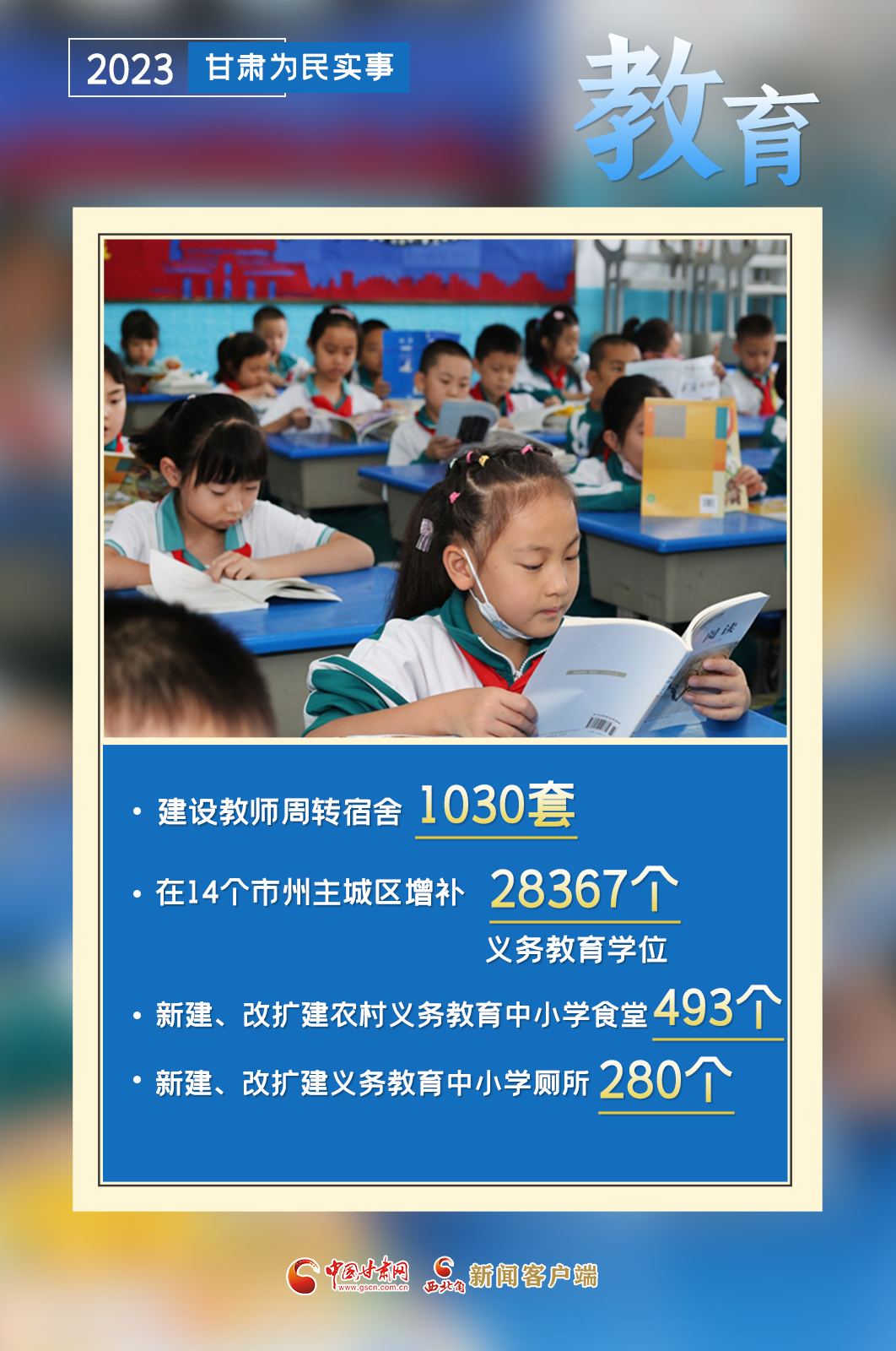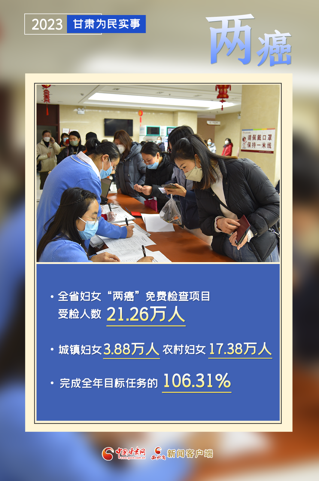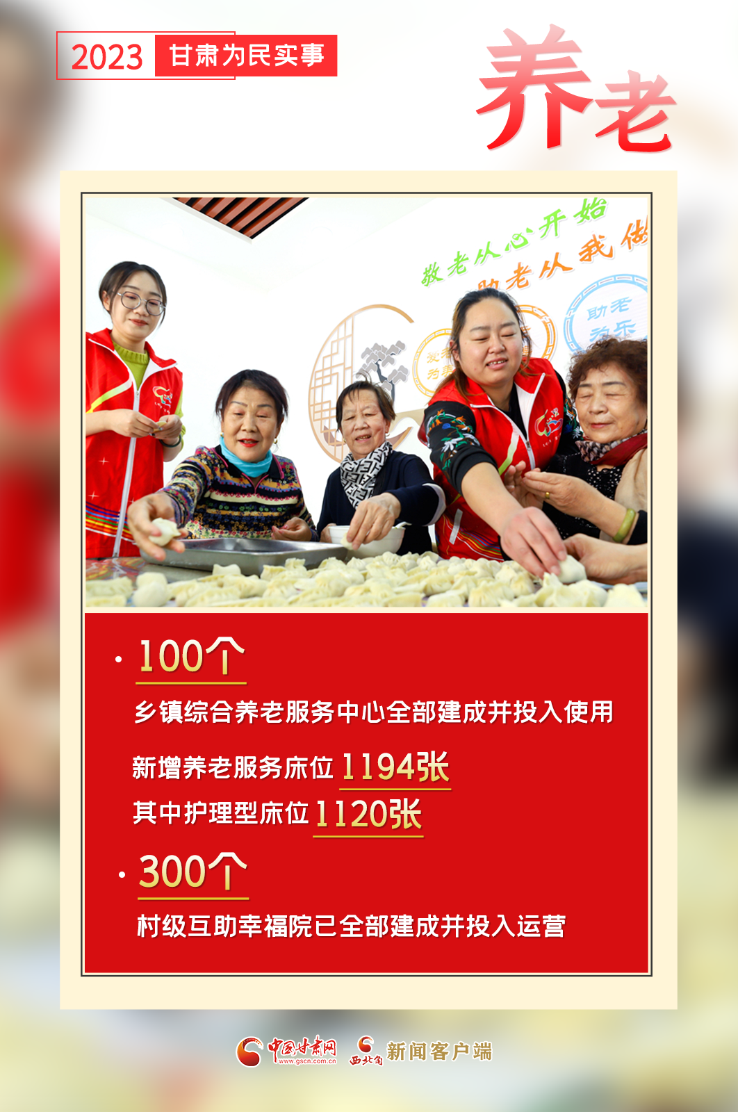 民生是人民幸福之基、社会和谐之本。2023年甘肃省十四届人大一次会议审议通过的《政府工作报告》,确定实施建设100个乡镇综合养老服务中心、20万名城乡妇女“两癌”免费检查等10件为民实事,一年来,这些为民实事完成情况如何,请看下图!