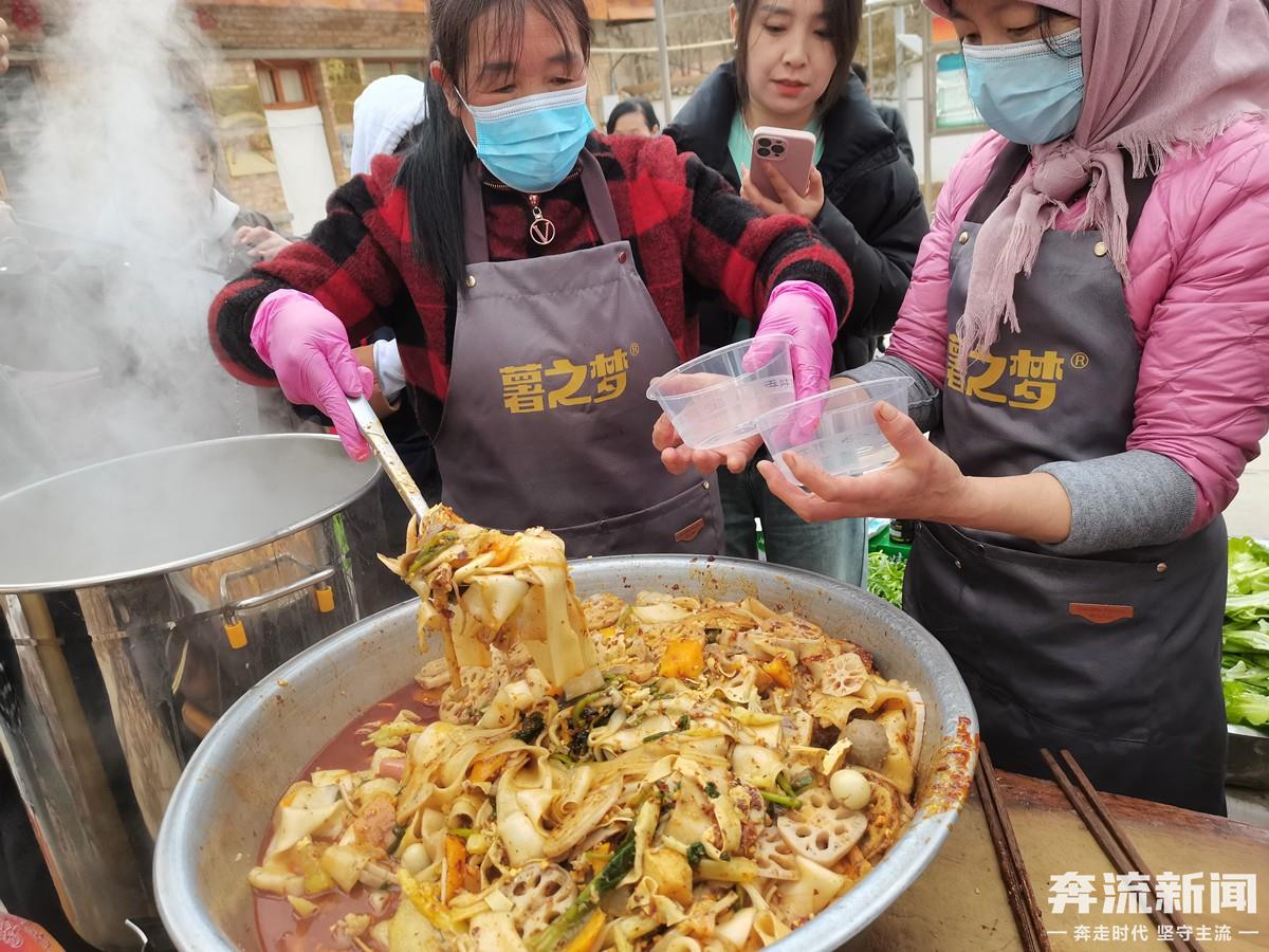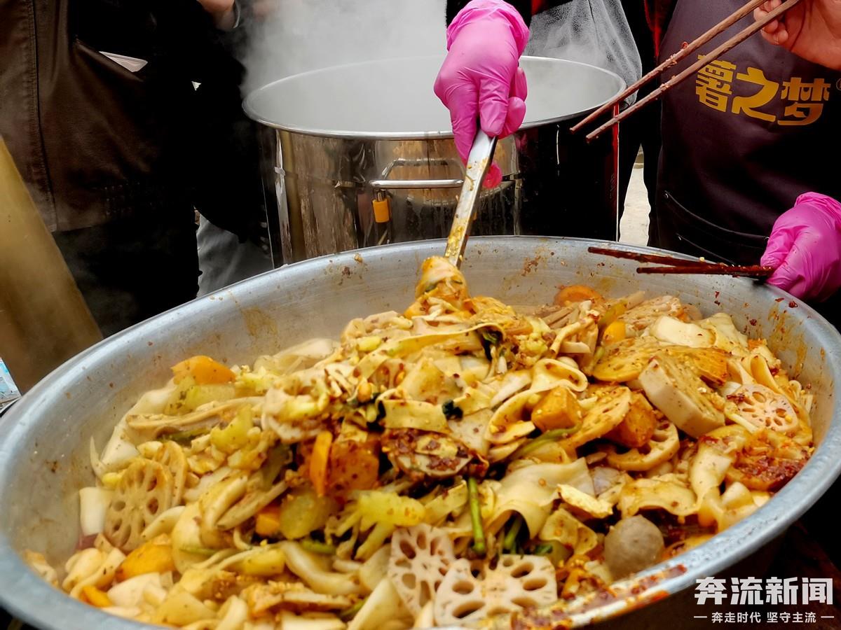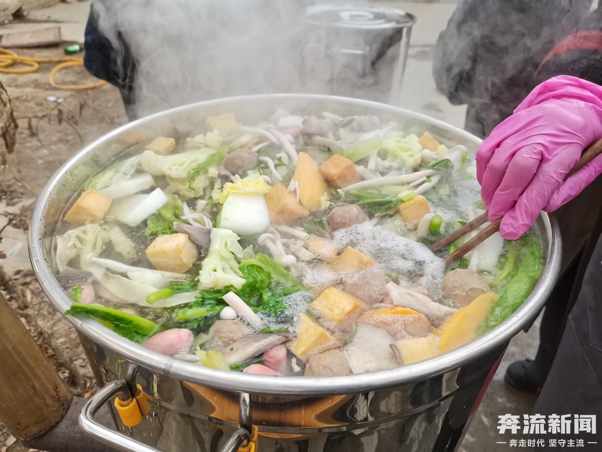 17日一早,李先生就购买了土豆、粉条、豆腐等当地食材,还有麻辣烫的“灵魂汁子”——香辣酱。临近中午的时候,村委会院子里的火炉架了起来,煮好的食材出锅后,拌上了香辣酱,一锅香气四溢的麻辣烫出锅了。