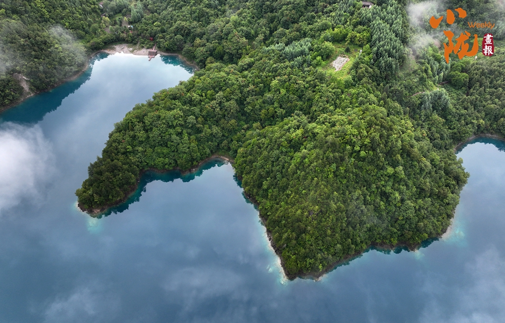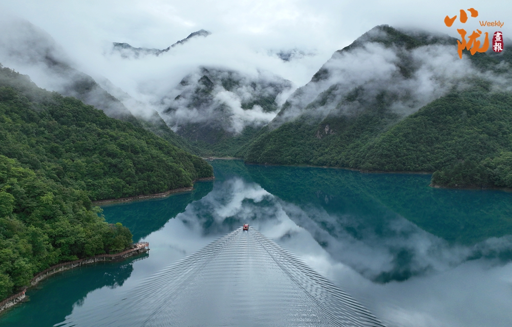 两岸种类繁多的茂密植被、清澈如玉的湖水和雾遮云绕的奇峰构成一幅山水画卷。