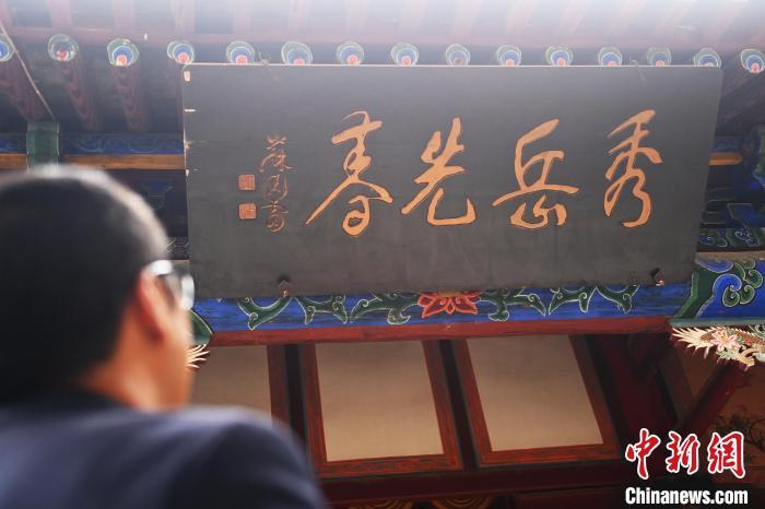 10月23日,甘肃省天水市秦安县凤山景区,讲解员介绍鲁岱下人许行所题隶书“秀岳先春”的匾额。匾额文化是中华民族独特的民俗文化,它把辞赋诗文、书法篆刻、建筑艺术融为一体。秦安作为历史文化名城,其不少景区内都存在历史名人所题珍贵匾额,见证了历史变迁。中新社记者 李亚龙 摄