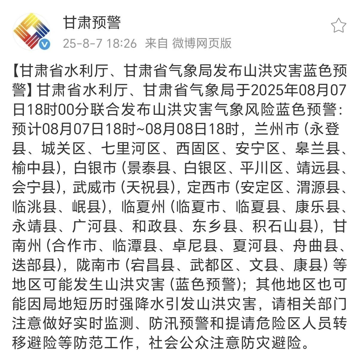 甘肃省水利厅、甘肃省气象局于2025年08月07日18时00分联合发布山洪灾害气象风险蓝色预警:预计08月07日18时~08月08日18时,兰州市(永登县、城关区、七里河区、西固区、安宁区、皋兰县、榆中县),白银市(景泰县、白银区、平川区、靖远县、会宁县),武威市(天祝县),定西市(安定区、渭源县、临洮县、岷县),临夏州(临夏市、临夏县、康乐县、永靖县、广河县、和政县、东乡县、积石山县),甘南州(合作市、临潭县、卓尼县、夏河县、舟曲县、迭部县),陇南市(宕昌县、武都区、文县、康县)等地区可能发生山洪灾害(蓝色预警);其他地区也可能因局地短历时强降水引发山洪灾害,请相关部门注意做好实时监测、防汛预警和提请危险区人员转移避险等防范工作,社会公众注意防灾避险。