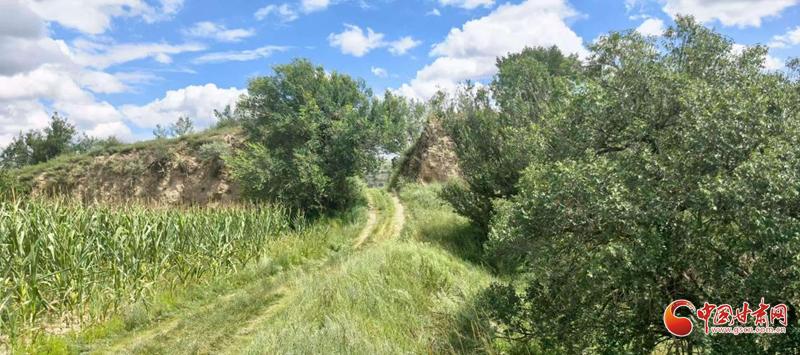 稍作停留,步行穿过一大片长势旺盛玉米地,迫不及待登上了城墙制高点。茫然四顾,大地寂静,四周山峦翠抱,大片玉米地透着几分肃穆,杜梨树、沙棘与酸枣长势旺盛,枝繁叶茂地点缀在沟壑崖边。此时,一边享受北方的习习凉风拂面而来,一边细细打量眼前的地形:易守难攻,退可凭险防守,进可顺势攻伐,是一处极具战略意义的要地。