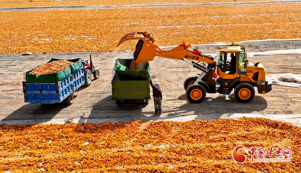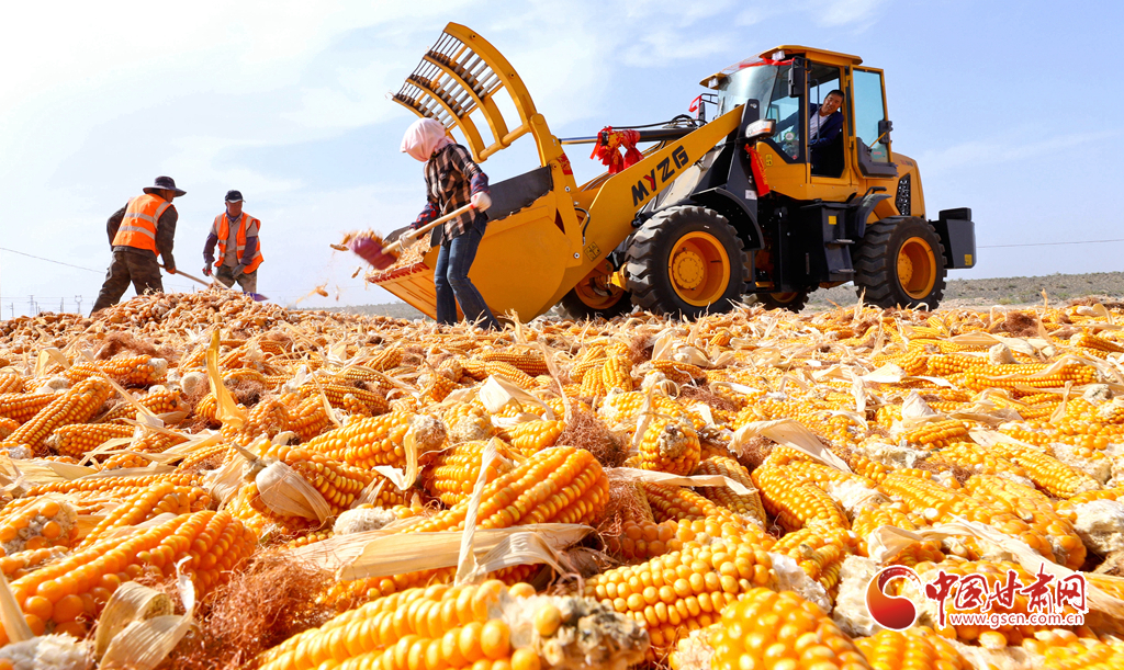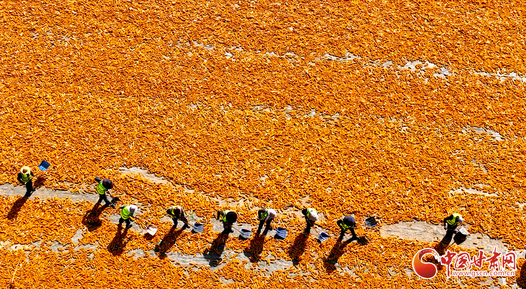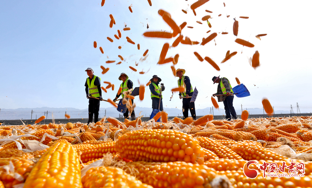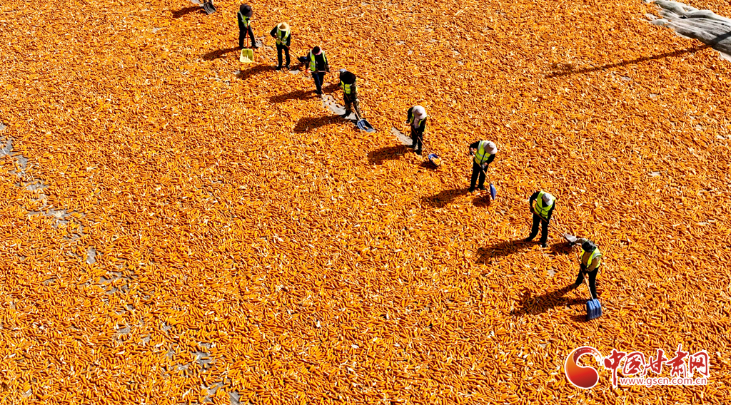 9月11日,张掖市高台县南华工业园区制种玉米晾晒场内,工作人员正在翻晒制种玉米。当前,高台县制种玉米全面进入采收、晾晒和加工高峰期,全县各个晾晒场有序开展捡杂、晾晒、运输与加工等作业,一派繁忙景象。