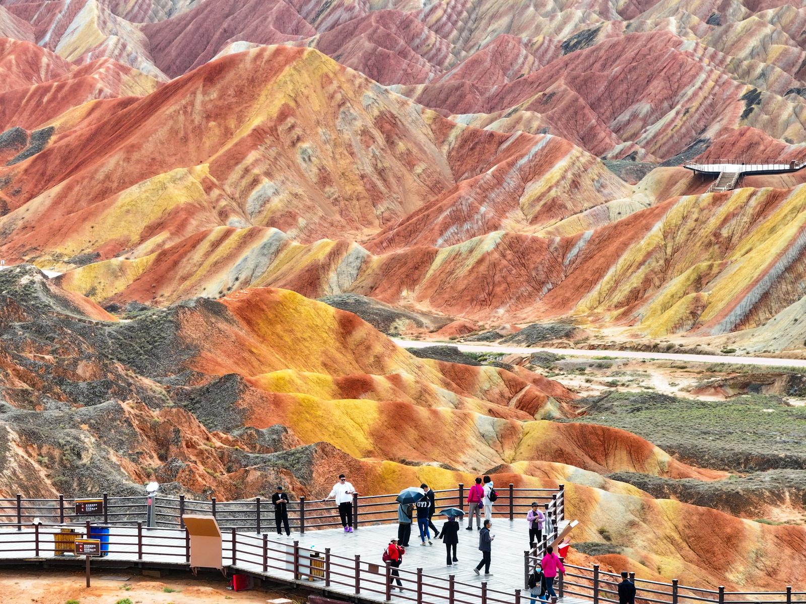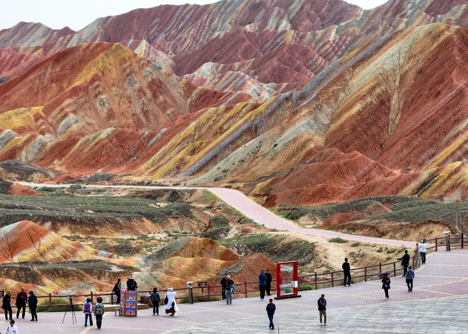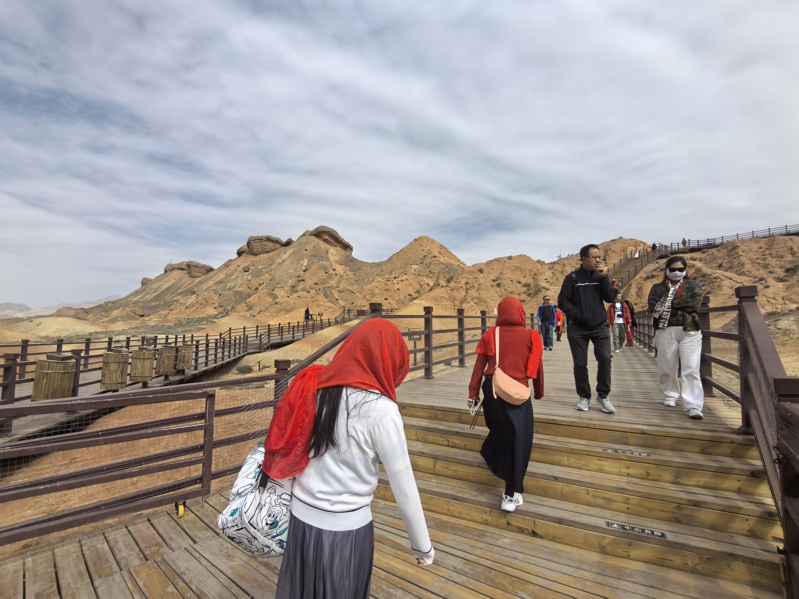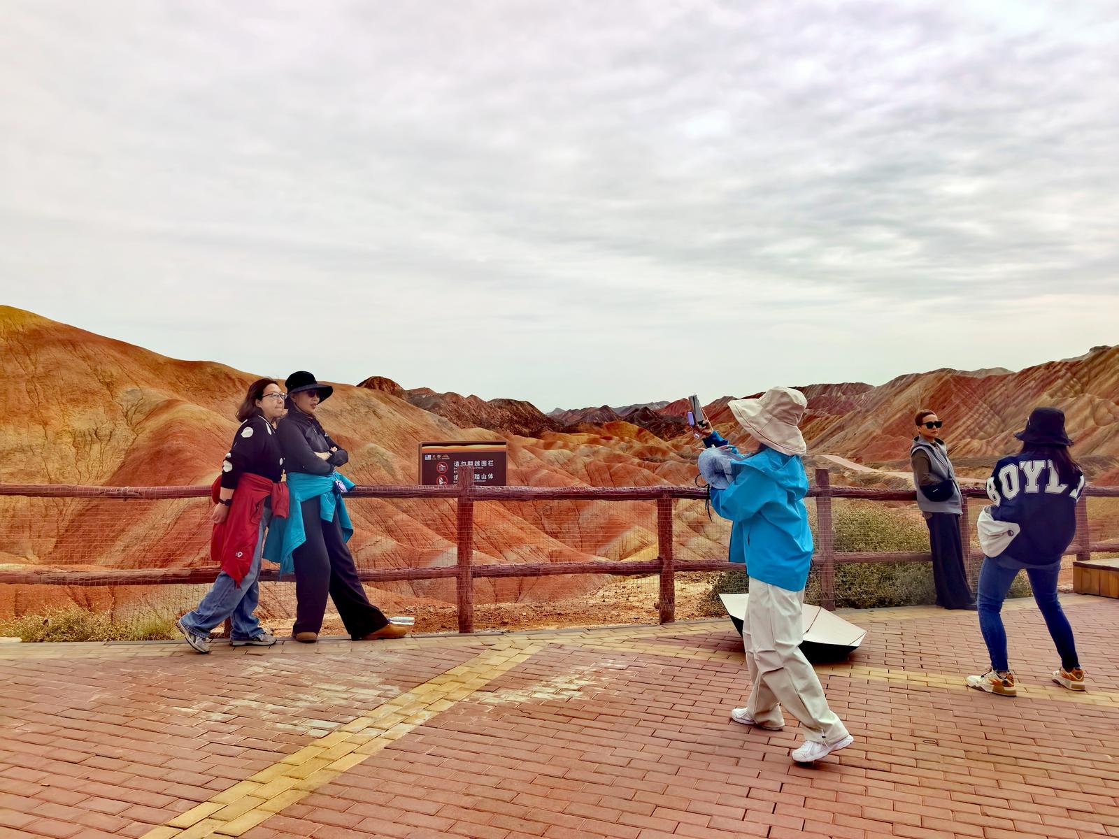 “第一次来看,很壮观。特别是雨后,五颜六色,斑斓明艳,跟网上看到的不太一样,身临其境,很震撼。”山西游客王女士来张掖七彩丹霞之前从未想过,大山竟能挣脱单调的灰褐,幻化成一幅流动的油画,将大自然的偏心与慷慨,尽数铺展在西北的天地间。