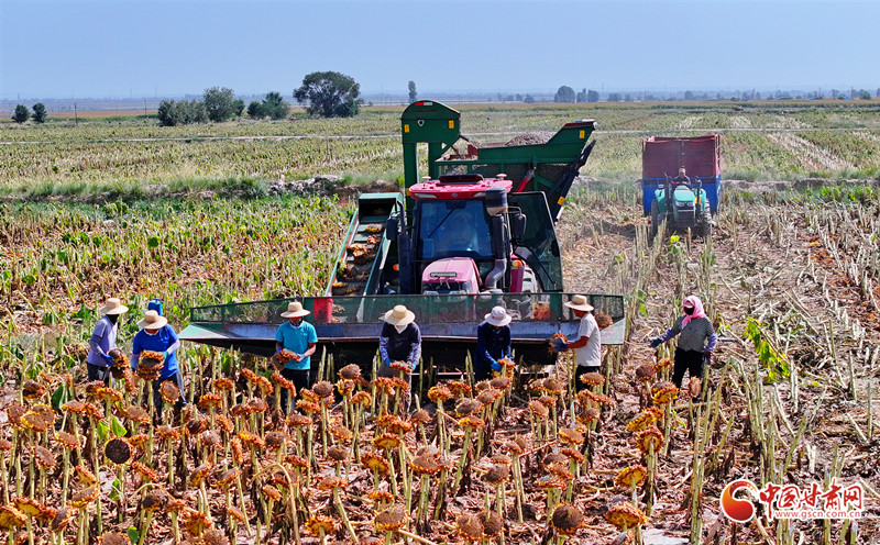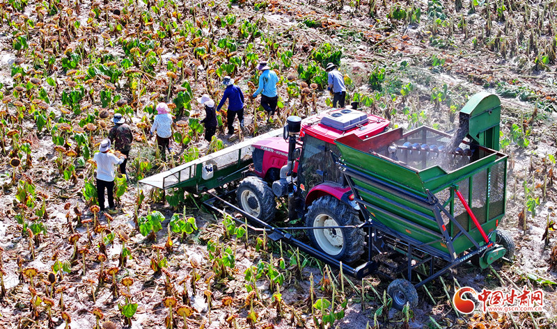 近日,在民乐县六坝镇韩武村千亩食用向日葵种植基地,采收、运输车辆来回穿梭,农户们在葵花收割机前一字排开,熟练地将已晒干的食葵盘投进收割机中脱粒,现场一派热火朝天的丰收景象。