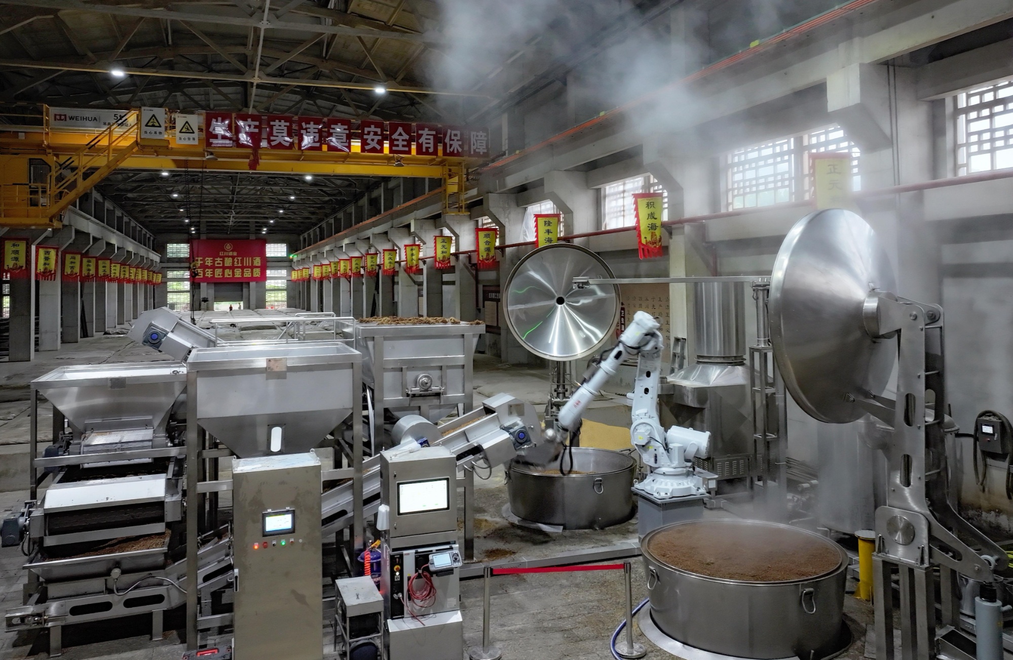 在新建成的酿酒车间,新引进的智能机器人正有条不紊地忙碌着,精准地执行着各项上甑工序,实现拌粮、物料运输、加糠壳的全方位自动化,每一个环节都严格遵循着科学标准。
