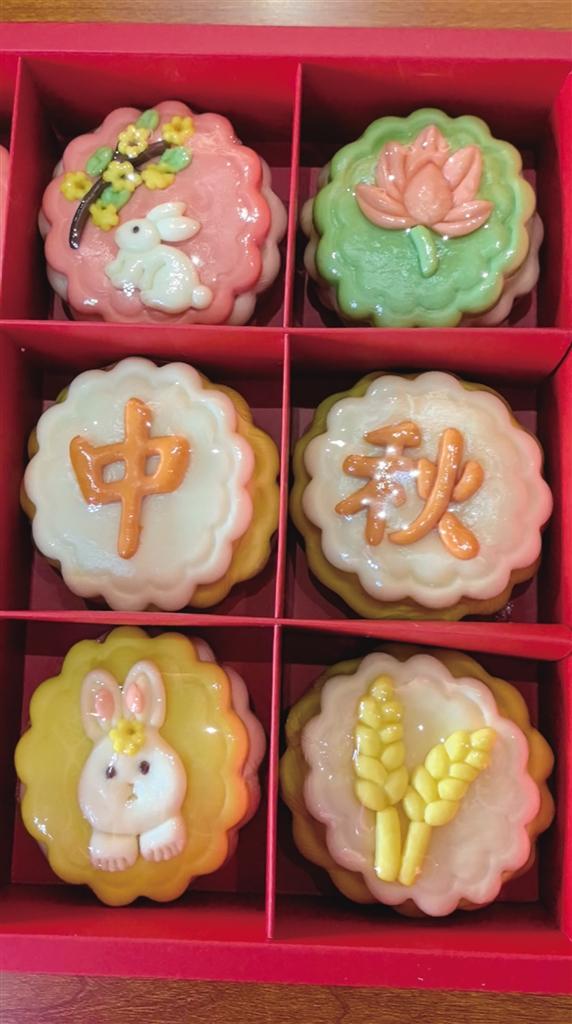 而在“兰州甜贝贝花馍”店里,月饼的造型和口味又玩出了新花样。开心果酥皮月饼,里面加了白芝麻和开心果,吃起来果香浓郁,满口留香。老板娘杨晓兰介绍道,“我们把祝福语直接印在月饼上,比如‘俏皮玉兔’‘好事发生’,让月饼更有家的温度。”